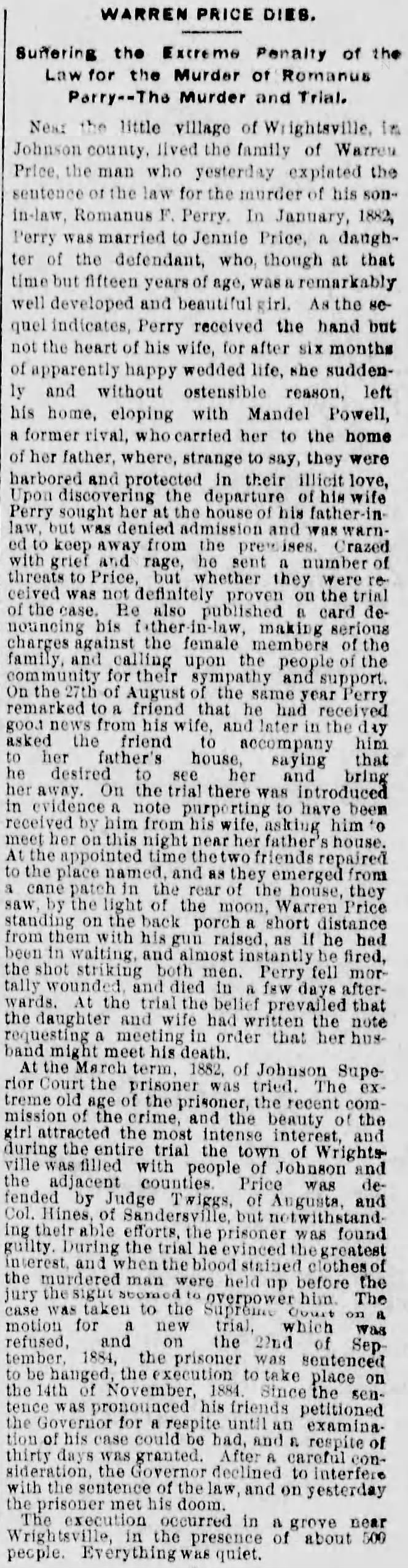 In 1882, Warren James (or James Warren) Price shot and killed his son-in-law. He was arrested, found guilty of the charge, and hanged in Johnson County, Georgia.